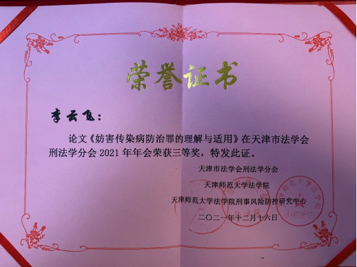 研究生踊跃参与年会征文,其中2020级硕士研究生李云飞同学的参会论文《妨害传染病防治罪的理解与适用》获本次年会优秀论文三等奖。