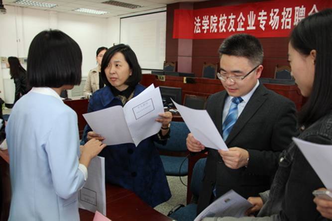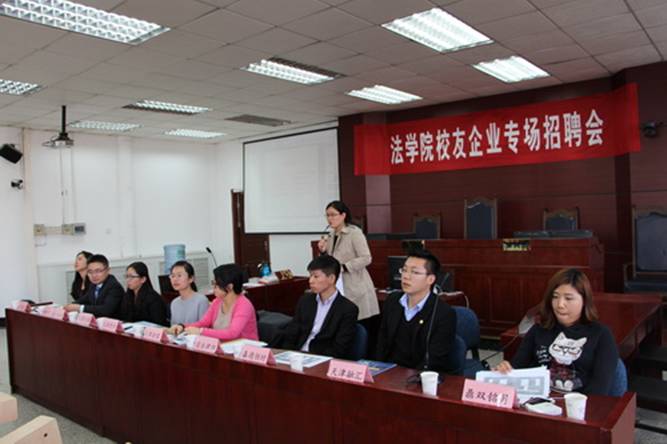 在模拟法庭召开校友企业专场招聘会。由学院校友会组织的北京康达律师事务所、天津四方君汇律师事务所、国浩律师事务所、杭州绿湾网络科技有限公司等十家快看漫画